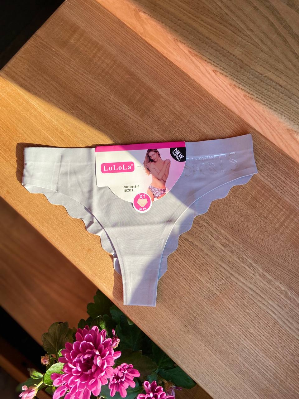 Безшовні жіночі труси-танга з хвилястим вирізом — середня посадка, еластичні, з написом збоку 9918-1SOL